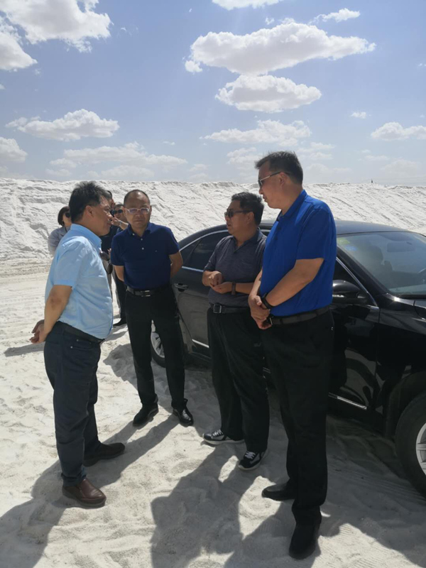 74下午,甘肃省盐务管理局局长谢建国、中盐甘肃省盐业集团有限责任公司执行董事、总经理、党委副书记何中信、中盐甘肃省盐业集团有限责任公司河西分公司党委书记杨玉斌等一行13人来公司调研。集团公司党委书记董事长孙刚德、党委副书记总经理李奎锦陪同前往盐湖和精盐分厂小包装生产线进行实地考察,之后在公司三楼会议室进行了座谈。