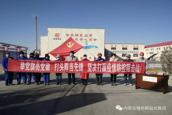党旗引领积极开展形式多样的主题党日活动。组建党员先锋队、党员志愿服务队,配合雅镇各社区,开展党员志愿服务活动,对镇区所有楼房、平房以及厕所等区域进行全面消杀,有效阻断疫情传播途径;协助雅镇进行值岗执勤,排查、监管重点人员;组织公司党员开展“举党旗亮党徽  打头阵当先锋  坚决打赢疫情防控阻击战”主题党日活动,精盐分厂党员积极主动清理卤水澄清池,对设备进行清洗;采盐分厂党员带头保放运,做好卤水净化等工作,为疫情防控期间能全面复工复产打下了坚实的基础,以实际行动践行了“疫情防控、党员先行”的承诺,充分彰显了共产党员在疫情防控中的先锋模范作用。